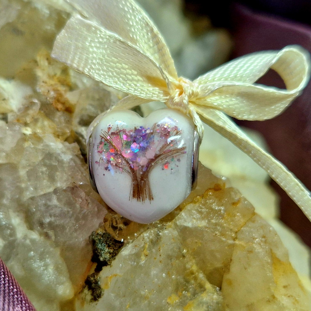 Finom, világos árnyalatú háttér és szikrázóan apró részletek ölelik körbe az emléket – mintha a szeretet és az idő egyetlen apró gyöngyszemben fonódna össze. A charm nemesacél és/vagy ezüst (925sterling) betétekkel készül, így kompatibilis a legismertebb charm karkötőkkel, láncokkal.