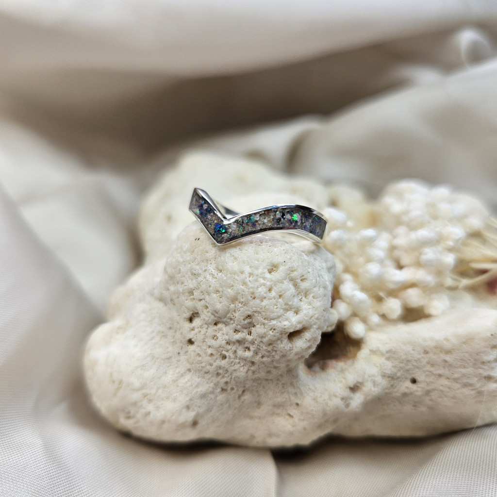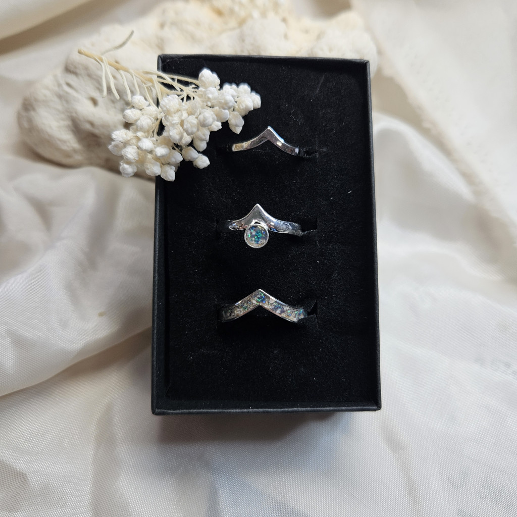 A „Hajlított fény” gyűrű finoman ívelt formája azt a pillanatot idézi, amikor a fény megtörik és új utat talál magának – ahogyan az emlékek is tovább ragyognak bennünk. 925 sterling ezüstből készült, 3 mm széles ívében hamvak és kékeszöld opál csillogása fonódik össze. Az opál apró fényvillanásai az örökké tartó emlékezés jelképei, míg a hamvak csendesen őrzik a legmélyebb kötődést. Ez a gyűrű nem csupán ékszer, hanem szívedhez közel hordozott történet: egy halk emlékeztető arra, hogy a szeretet fénye sosem halványul el.